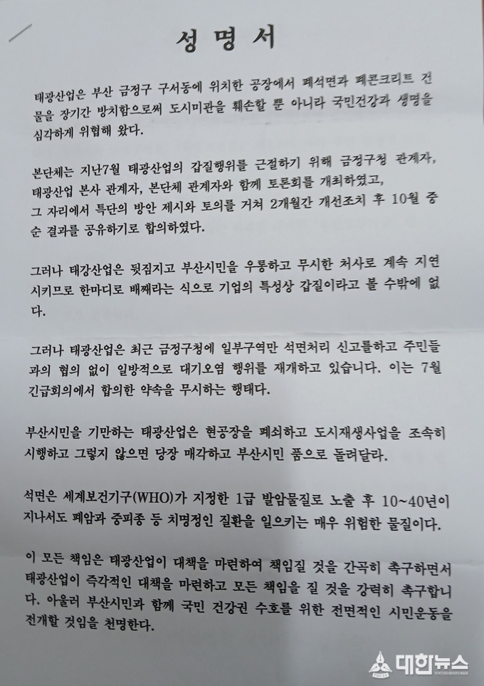 (대한뉴스 김기준 기자) = 부산 금정구 구서동에 위치한 태광산업 폐공장 부지에서 WHO 지정 1급 발암물질인 폐석면이 장기간 방치되고, 기업 측의 약속 불이행과 일방적인 석면 처리 재개로 인해 시민 건강권이 심각하게 위협받고 있다. 이에 부산NGO시민연합은 14일 성명서를 발표하고 강력 규탄 집회를 예고하며, 태광산업과 관리감독청인 금정구청을 맹렬히 비난하고 나섰다.