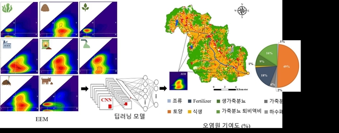 이번에 개발된 모형은 물속에 존재하는 용존유기물의 ‘여기-방출 행렬(Excitation-Emission Matrix, EEM) 형광 특성과 ‘심층학습(Deep learning)’ 기반의 인공지능(AI) 모델을 융합하여 유역 내 다양한 오염원의 종류를 신속하고 정밀하게 분석 및 정량화할 수 있는 기술을 포함하고 있다.