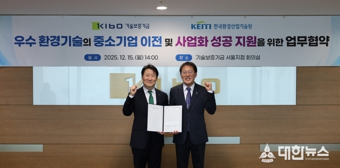 (대한뉴스 한원석 기자)=한국환경산업기술원은 12월 15일 오후 서울 여의도 기술보증기금 서울사무소에서 기술보증기금과 「우수 환경기술의 중소기업 이전 및 사업화 성공 지원을 위한 업무협약」을 체결했다.