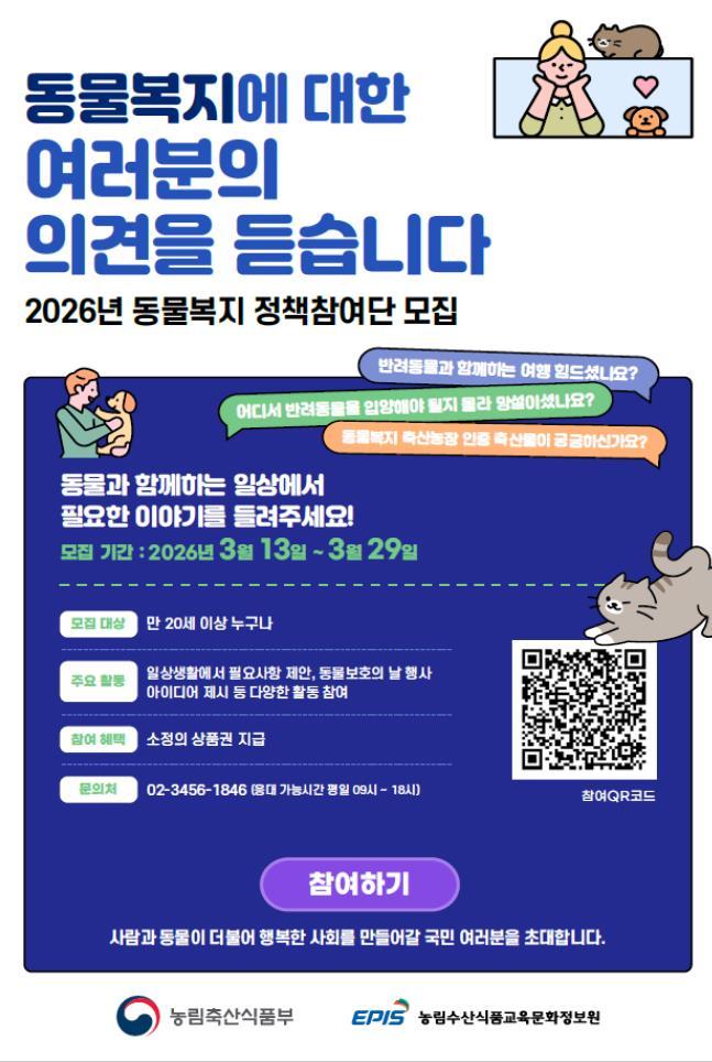 (대한뉴스 한원석 기자)=농림축산식품부(장관 송미령, 이하 농식품부)는 반려동물과 함께 생활하는 반려인 그리고 동물과 함께 생활하는데 관심이 많은 국민들의 의견을 듣기 위해 ‘농림축산식품부와 함께 하는 동물복지 정책참여단’을 모집한다고 밝혔다.