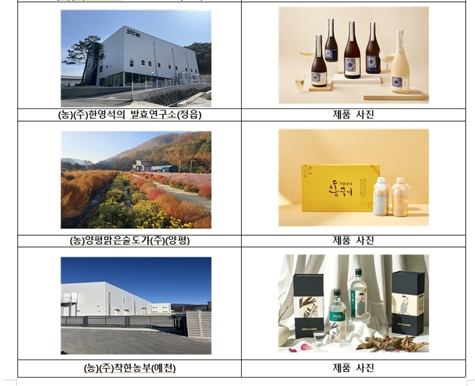 올해 선정된 양조장은 총 5곳으로, 충북 충주시 소재 ‘다농바이오’, 전북 순창군 소재 ‘친구들의 술 지란지교’와 정읍시 소재 ‘한영석의 발효 연구소’, 경기도 양평군 소재 ‘양평맑은술도가’, 경북 예천군 소재 ‘착한농부’이다.