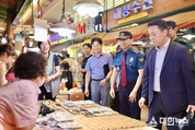 ▲치안현장(전통시장) 방문 사진. (대한뉴스 김기준 기자)=부산경찰청은 다가오는 추석 명절을 앞두고 시민들이 안전하고 평온한 연휴를 보낼 수 있도록 특별 치안활동에 총력을 기울이고 있다. 엄성규 부산경찰청장 직무대리는 2025년 10월 1일 오후 3시경, 유동 인구가 많은 부전시장을 직접 방문하여 특별 치안활동 및 주변 교통관리 상황을 점검하고 치안 현장 근무자들을 격려했다. 시장 및 치안 현장 점검: 엄성규 직무대리는 이날 부전시장을 순회하며 인파 밀집 우려 지역, 무질서 취약지 등 범죄·안전 취약 요소들을 면밀히 살폈다. 특히, 시장 주변 곳곳에서 근무하고 있는 지역경찰, 기동순찰대, 교통 근무자들을 만나 격려하며 안전한 명절 분위기 조성에 힘써줄 것을 당부했다. 이어 관할 부전지구대를 방문하여 연휴에도 쉼 없이 귀성객과 시장 이용객 안전 관리에 분주한 직원들의 노고를 치하하고, 소탈한 대화를 나누며 현장의 목소리를 청취했다. 추석 명절 종합 치안대책 추진: 부산경찰청은 평온한 명절 분위기 조성을 위해 이미 9월 29일부터 10월 12일까지 2주간 전 기능이 협업하는 추석명절 종합 치안대책을 추진 중입니다. 주요 치안 활동으로는 다음과 같다 범죄·안전 취