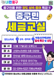 ▲세금교실 포스터. (대한뉴스 김기준 기자)=서울 중구가 어렵게만 느껴지는 세금에 대한 이해를 돕기 위해 오는 17일 오후 2시 신당누리센터 5층 대강당에서 <중구민 세금교실> 특강을 연다. 다솔세무법인 대표 세무사이자 한국세무사회 연수원 교수인 안수남 세무사가 강사로 나서 변화하는 세법에 따른 세금상식과 부동산 관련 절세 방법을 알려준다. 양도소득세 분야 전문가인 안수남 세무사는 어렵고 복잡한 세금상식을 사례 위주로 쉽게 풀어줄 예정이다. 강의 후에는 중구 야간 세무상담을 담당하는 전문 세무사들이 일대일 맞춤형 상담을 통해 개인별 절세 전략을 알려준다. 상담은 선착순 사전신청자 30명을 대상으로 한다. 특강 참여와 상담을 원하는 경우에는 중구청 홈페이지( 중구청 홈페이지>소통참여>온라인접수신청>중구민 세금교실 메뉴) 또는 유선(☎02-3396-5221)으로 신청하면 된다. 한편, 구는 지난 9월 약수동과 다산동 주민센터에서 <찾아가는 세금교실>을 개최해 세금 관련 주민들의 세금 관련 궁금증을 해소했다. 다음달 11일에는 약수교회로 찾아간다. 구 관계자는 “구민들에게 꼭 필요한 실용적인 교육을 지속적으로 마련해 생활의 불