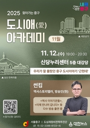 ▲중구 도시애(愛) 아카데미 포스터. (대한뉴스 김기준 기자)=서울 중구가 오는 11월 12일(수) 저녁 7시 신당누리센터 5층 대강당에서 네 번째 <찾아가는 중구 도시愛(애) 아카데미>를 개최한다. 이번 강연은 방송인 겸 역사 스토리텔러로 활약하는 썬킴 교수를 초청해 '우리가 잘 몰랐던 중구 도시 이야기'라는 주제로 진행될 예정이다. 근·현대 중구의 흥미로운 역사와 공간 이야기 썬킴 교수는 이번 아카데미에서 근·현대 중구의 역사와 공간을 따라가는 흥미진진한 시간 여행을 선사한다. 강연 주요 내용은 다음과 같다. ▲동대문 의류타운의 탄생 배경▲영화 '서울의 봄' 배경지였던 남산골 한옥마을 (수도방위사령부 터)▲대한제국 남대문 시가지 전투의 숨겨진 이야기▲장충단이 공원이 된 배경▲세운상가와 을지로 개발의 역사 썬킴 교수는 《썬킴의 세계사 완전 정복》 등 다수의 저서와 <역사 이야기꾼들>, <이제 만나러 갑니다> 등 다양한 방송 활동을 통해 대중에게 쉽고 재미있게 인문학과 역사를 전달해 온 인기 강연자로 알려져 있다. 주민 호응 속 이어지는 명사 초청 강연 지난 8월 새롭게 시작된 <중구 도시愛(애) 아카데미>는 일반