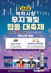 ▲백학시장 무지개빛 점등 대축제 포스터. (대한뉴스 김기준 기자)=서울 중구가 오는 14일(금) 오전 11시부터 백학시장(퇴계로 86길 일대)에서 <백학시장 무지개빛 점등대축제>를 연다. 이번 축제는 밝고 생동감 있는 시장 분위기를 조성해 야간 상권에 활력을 불어넣고 전통시장의 매력을 재발견하기 위한 자리다. 행사의 하이라이트는 일몰 시간인 오후 5시 30분에 맞춰 진행되는 ‘야간 경관조명 점등식’이다. 중구는 지난 7월부터 10월까지 두 차례에 걸쳐 백학시장 도로 상부 약 350미터 구간에 LED 조명을 설치해 시장을 방문하는 주민들에게 따뜻하고 활기찬 야간 분위기를 선사하고 있다. 특히, 이번 점등으로 ‘빛의 거리’로 새롭게 태어나는 백학시장은 단순히 장을 보는 공간을 넘어서 머물고 싶은 전통시장으로 거듭날 전망이다. 점등식 이후에는 주민 노래 한마당과 축하공연이 이어져 시장을 찾은 고객들에게 흥겨운 볼거리와 즐길거리를 제공한다. 또한, 오전 11시부터 오후 5시까지는 동대문 평화시장이 참여하는 플리마켓이 열린다. 모자, 머플러 등 겨울맞이 상품을 판매하며, 오후 3시부터는 시장 대표 먹거리를 한자리에서 즐길 수 있는 야간 먹거리장터가 운영된다