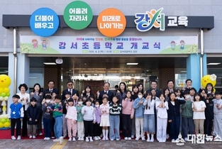 (대한뉴스=김기준 기자)= 인공지능(AI)과 첨단 기술이 공존하는 미래형 수변도시, 부산 강서구 에코델타시티에 아이들의 첫 함성이 울려 퍼졌다. 서부산권 교육의 핵심 거점이 될 강서초등학교(교장 신동현)가 4월 2일 오전 10시 30분, 학교 강당에서 성대한 개교식을 개최하고 본격적인 운영에 들어갔다. 이날 개교식은 신도시의 첫 교육 기관 탄생을 축하하는 지역 사회의 열기로 뜨거웠다. 김석준 부산광역시교육감과 최경이 북부교육지원청장을 비롯해 학생, 학부모, 지역 관계자 등 300여 명이 참석해 강서초등학교의 새로운 출발을 응원했다. 행사는 학교 현관에서의 테이프 커팅식을 시작으로 화려하게 막을 올렸다. 이어 진행된 식전 공연 ‘샌드아트(Sand Art)’는 황무지였던 에코델타시티 부지에 학교가 세워지고, 그곳에서 아이들이 꿈을 키워가는 과정을 감동적으로 그려내 참석자들의 큰 박수를 받았다. 교기 전달식에서는 김석준 교육감이 신동현 교장과 학생·학부모 대표에게 교기를 직접 전달하며, 지역 사회와 함께 성장하는 학교의 정체성을 강조했다. 김 교육감은 축사20260402 부산 강서초 에코델타시티 교육 거점으로 힘찬 출발_붙임1에서 “강서초등학교는 에코델타시티 대규