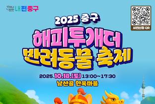 ▲홍보포스터. (대한뉴스 김기준 기자)=서울 중구가 반려인구 3만 명 시대를 맞아 반려견 축제 '2025 해피투개(dog)더'를 개최한다. 올해로 3회째를 맞이한 이번 축제는 10월 18일 오후 1시부터 5시 30분까지 남산골 한옥마을에서 열린다. 특히, 이번 축제는 ‘충무공 이순신 탄생지, 중구’의 의미를 살려 용맹과 지혜, 교감을 주제로 다채로운 프로그램을 마련해 눈길을 끈다. 반려견 재능부터 상식까지, 놓칠 수 없는 주요 프로그램! 축제는 오후 1시 식전 행사부터 활기를 띤다. 반려견의 재능을 겨루는 '충무견 선발대회 예선전'과 반려동물 에티켓 및 이순신 장군 상식으로 진행되는 '골든벨 퀴즈대회'가 축제의 시작을 알린다. 오후 2시부터는 본격적인 무대가 시작된다. '충무견 선발대회 결선'과 전문 시범단의 박진감 넘치는 '어질리티 공연'이 관람객의 눈을 사로잡을 예정이다. 반려견과의 행복한 일상을 담은 '댕스타그램 in 중구' 사진 공모전 시상식도 함께 진행된다. 오후 3시에는 보호자와 반려견이 함께 즐기는 놀이마당이 펼쳐진다. 반려견이 미션을 수행하는 '멍량해전'과 달리기, 보호자 빨리 찾기 등으로 구성된 '반려견 운동회'를 통해 특별한 교감의 시간을