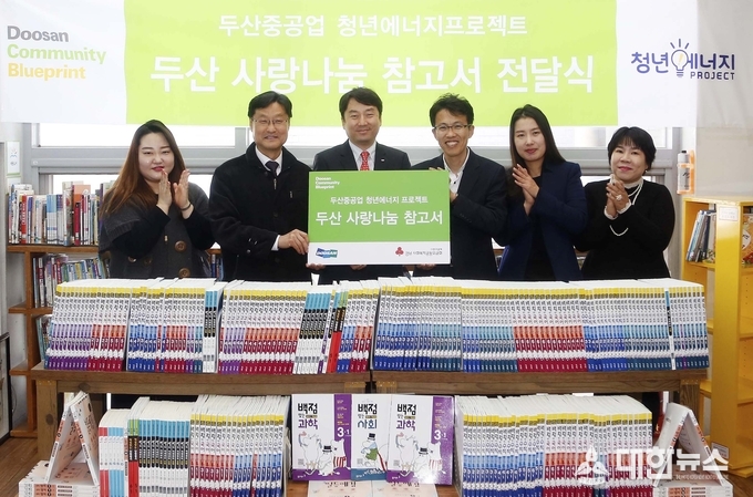 두산중공업이 서울·창원지역 자매결연 아동센터와 아동양육시설 등 81곳에 ‘두산 사랑나눔 참고서'를 전달했다고 10일 밝혔다. 두산중공업은 9일 경남 창원에 위치한 해피타임 지역아동센터에서 전달식을 갖고, 총 29종, 5700여 권의 참고서를 서울·창원지역 복지시설 초·중학생 1800여 명에게 전달했음. 두산중공업은 2011년부터 7년째 매 학기 아동복지시설에 학습 참고서를 지원해왔으며, 현재까지 전달된 도서는 4만 여 권에 이른다.