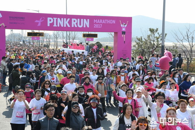 ‘2017 핑크런’의 첫 대회가 19일 부산 다대포 해수욕장에서 성황리에 개최됐다. ㈜아모레퍼시픽은 기존의 ‘핑크리본 사랑마라톤’에서 캠페인 의미를 담는 동시에 기억하기 쉽고 부르기 좋은 ‘핑크런’을 새 이름으로 선정했다. 핑크런은 참가자 스스로의 건강을 챙기는 동시에 참가비 전액이 한국유방건강재단에 기부되어 저소득층 유방암 환우를 위한 수술치료비 지원 등에 사용되는 착한 러닝 축제이다.