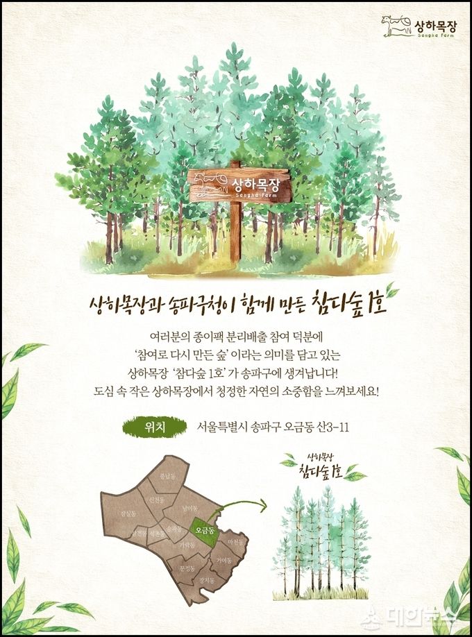 매일유업의 상하목장이 ‘종이팩 분리 배출 캠페인’에 참가한 주민과의 약속을 실천하기 위해 송파구청과 함께 오금동 일대 900여 평에 ‘참다숲’을 조성한다. ‘참다숲’이란 주민들의 자발적인 참여로 만들어진 도심 속 건강한 숲을 뜻한다.