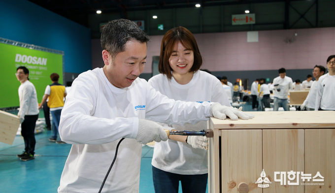 박정원 두산그룹 회장은 봉사활동에 참여해 한부모 가정에 전달할 수납장과 책상을 만들었다. 가구는 각 가정의 공간을 최대한 효율적으로 활용할 수 있도록 맞춤 제작됐다. 박 회장은 “‘Doosan Day of Community Service’ 행사는 두산과 지역사회가 함께하는 나눔의 축제로 자리잡아 가고 있다”며 “임직원들이 이웃에게 따뜻한 마음을 전하고, 나눔의 즐거움을 경험하는 기회가 되길 바란다”고 말했다.