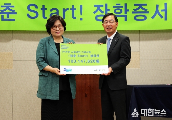 ㈜두산은 12일, 서울 중구 라마다호텔 동대문에서 ‘청춘 Start! 장학증서 수여식’을 열어 서울장학재단(이사장 문미란)에 장학금 1억 원을 전달했다. 이 장학금은 올해 선발된 장학생 20명의 학비 지원 등에 쓰여질 예정이다.