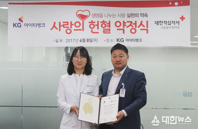 KG아이티뱅크(대표 문용우)는 대한적십자사 서울동부혈액원과 8일 오전10시에 KG아이티뱅크 회의실에서 정기적인 헌혈 동참과 건전한 기부문화 및 자원봉사활동 확산에 관한 내용으로 사랑의 헌혈 약청을 체결하였다.