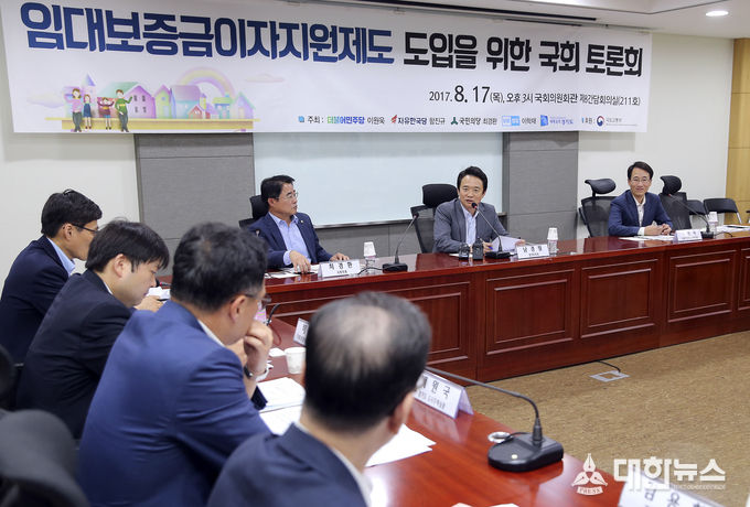 경기도가 시행하고 있는 ‘따복하우스 및 행복주택 임대보증금 이자지원 사업’의 전국 확대방안을 논의하는 국회 토론회가 17일 국회의원회관 제8간담회의실에서 열렸다. 이날 토론회에는 남경필 경기도지사와 국토교통부 이문기 주택정책관, 기획재정부 배병관 부동산정책팀장, 민달팽이유니온의 조현준 사무처장, 건설산업연구원 허윤경 연구위원, 경기복지재단 유병선 연구위원 등 50여명이 참석했다.