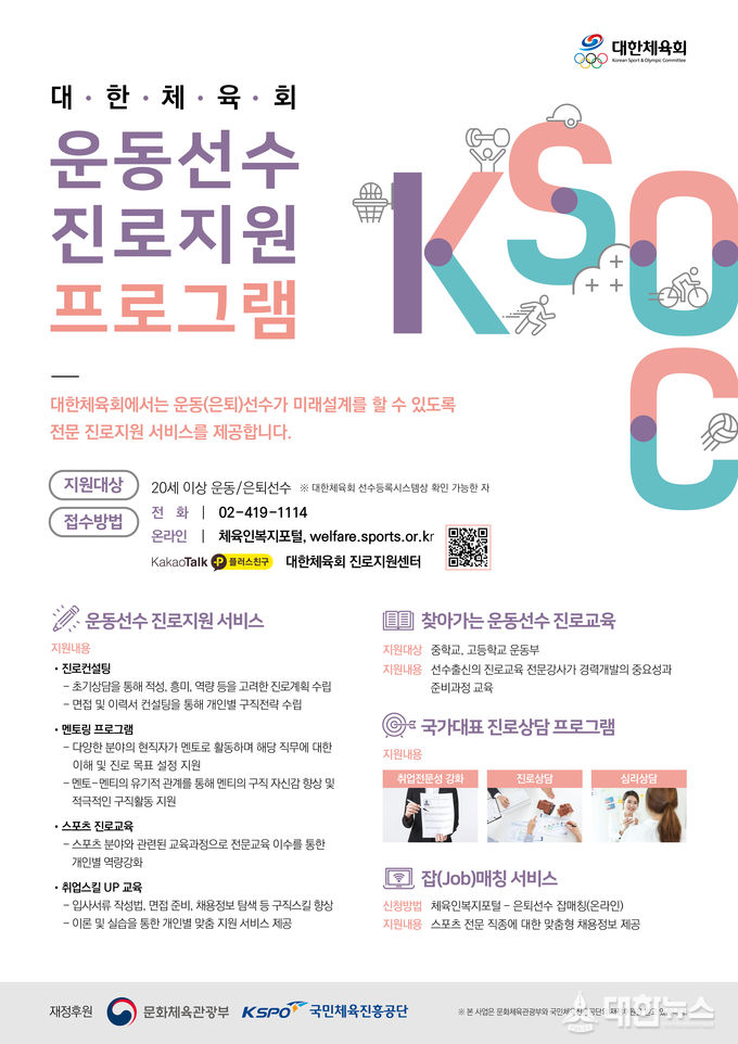 대한체육회(회장 이기흥)는 10월 5일(토)부터 9일(수)까지 제100회 전국체육대회에 참가하는 선수, 지도자, 학부모 등을 대상으로 온·오프라인 선수 진로 지원 사업을 홍보한다.