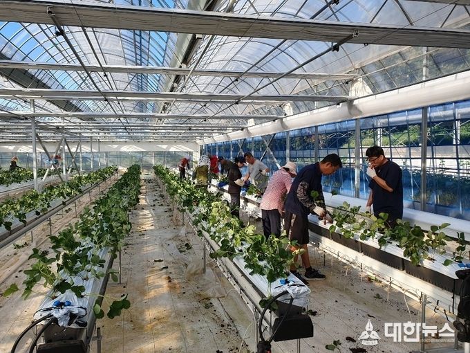 앞서 지난달 중순께 체류형 입교생 20여명은 농업창업지원센터 공동실습하우스(979㎡)에 딸기 정식을 완료했다. 현재는 뿌리가 활착해 잎이 뻗어 나오고 있는 상태다.