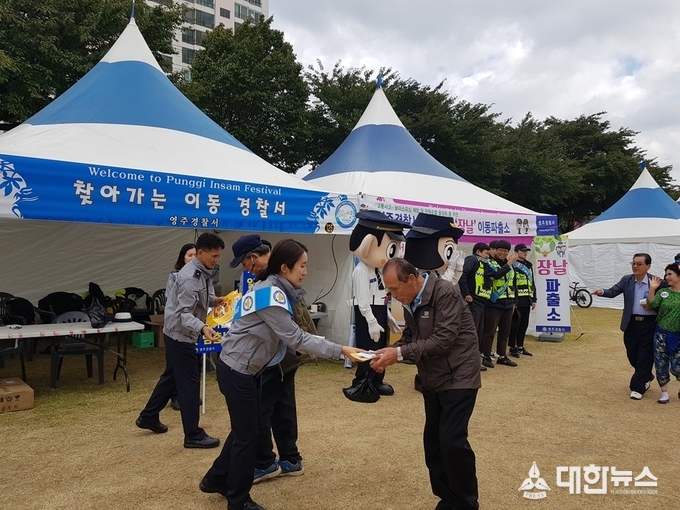 영주경찰서(서장 김상렬)는 10월 15일 풍기인삼축제장에서 장날파출소를 열고 인터넷 사기 등 ‘서민 3不 근절’과 ‘교통사고 예방’ 캠페인을 펼쳤다.