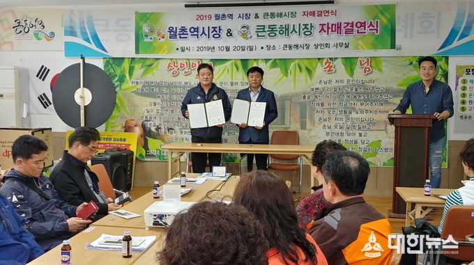 포항 큰동해시장(상인회장 김병석)은 지난 20일 대구 월촌역 시장(舊 송현주공시장-상인회장 박영배)과 전통시장의 발전과 활성화를 위한 상호 협력과 연대를 주요 내용으로 자매결연을 맺었다고 밝혔다.
