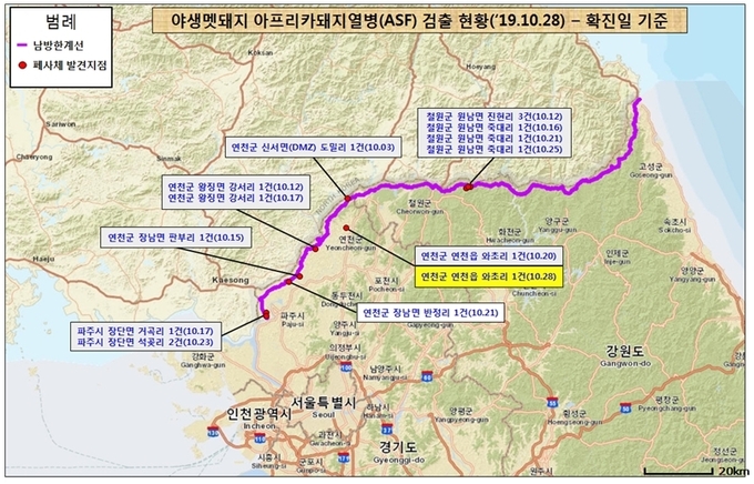 국립환경과학원은 10월 28일 오후 11시경 아프리카돼지열병 바이러스를 확진하고 결과를 관계기관으로 통보하였다. 현재까지 전국적으로 확진된 야생멧돼지 아프리카돼지열병은 모두 16건으로 늘어났다.