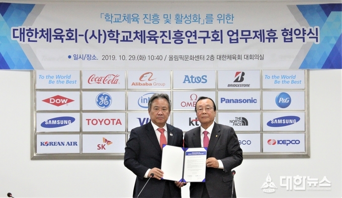 대한체육회(회장 이기흥)는 10월 29일(화) 올림픽문화센터에서 사단법인 학교체육진흥연구회(회장 황수연)와 업무협약을 체결하고, 학교체육 활성화를 위해 상호 협력하기로 했다.