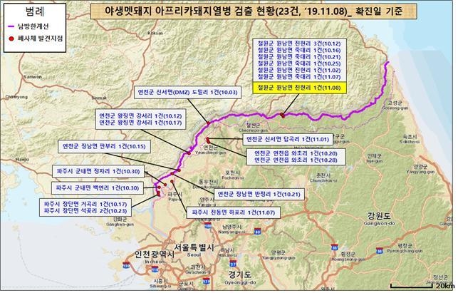 지난 11월 6일 오전 7시 경 군부대는 순찰 중 포획틀에 잡힌 멧돼지를 발견하여 과학원과 지자체로 신고한 후 주변 접근을 통제했다. 과학원은 같은 날 오후 4시 경 야생멧돼지 아프리카돼지열병 표준행동지침에 따라 시료를 채취했다. 철원군과 군부대는 현장소독 후 사체를 매몰처리했다.
