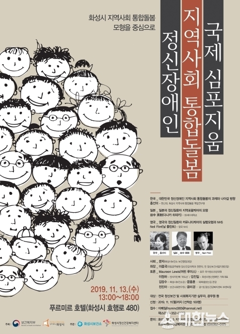 화성시가 13일 오후 1시 푸르미르호텔에서 ‘정신장애인 지역사회 통합돌봄 국제 심포지엄’을 개최한다. ‘화성시 지역사회 통합돌봄 모형을 중심으로’라는 주제 아래 열리는 이번 국제 심포지엄은 보건복지부와 화성시가 공동으로 주최하고 화성시 보건소, 화성시정신건강복지센터가 공동 주관한다.