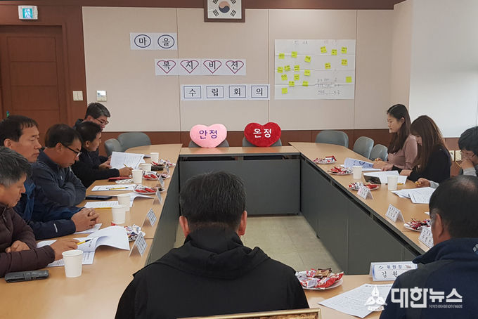 회의는 맞춤형복지팀장의 진행으로 마을 일반현황 및 복지현황을 소개하고 이를 바탕으로 강점과 약점, 기회와 위협요소를 분석하여 관내 지역자원의 효율적 활용과 복지사각지대 해소를 위한 ‘인정(人情)으로 온정(溫情)잇는 행복 안정(安定)마을’이란 마을복지비전을 제시했다.