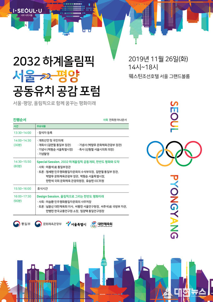 대한체육회(회장 이기흥)는 11월 26일 서울 소공동 웨스틴조선호텔 그랜드볼룸에서 ‘서울-평양, 올림픽으로 함께 꿈꾸는 평화미래’를 주제로 「2032 하계올림픽 서울-평양 공동유치 공감 포럼」을 문화체육관광부, 통일부, 서울특별시와 공동으로 개최한다.