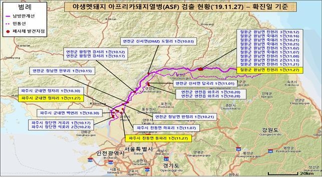 국립환경과학원은 폐사체에서 11월 27일 아프리카돼지열병 바이러스를 확진하고 결과를 관계기관에 통보했다. 이로써 철원에서 13건, 파주에서 8건의 아프리카돼지열병이 확진됐으며, 전국적으로는 29건으로 늘어났다.