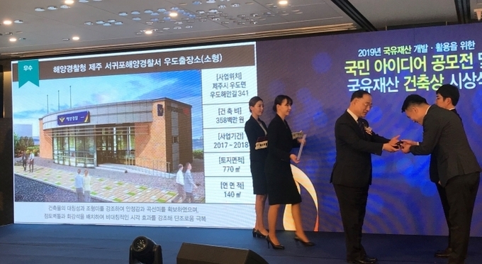 해양경찰청(청장 조현배)은 기획재정부가 주관하는 ‘2019년 국유재산 건축상’에 서귀포해양경찰서 우도출장소가 소형 부문 우수상을 수상하였다고 11일 밝혔다.