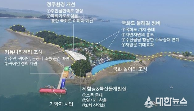 또한 어항시설 정비 ,독살 복원 및 해변정리,개방형 평화기념 놀이터 등 총 97억 원을 투입해 연간 100여개의 신규 일자리를 창출할 방침이다. 천혜의 비경을 자랑하는 국화리는 둘레길 정비 ,국화 놀이터 조성 ,여객선 접안 시설 및 선양장 보수,어항시설 정비 ,귀어귀촌센터 조성 등 138억 원을 투입해 살기 좋고, 살고 싶은, 가고 싶은 국화도를 만들 예정이다. 이에 시는 지역주민으로 구성된 지역협의체와 유관기관, 전문가와 협업해 내년 상반기부터 본격적인 사업을 추진할 계획이다.