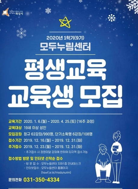 화성시여성가족청소년재단(대표이사 노영래) 유앤아이센터에서는 12월 16일부터 2020년 1학기 평생교육 수강생을 추가모집한다. 정원 미달강좌에 한해서 선착순 방문접수를 한다. 1학기 평생교육 프로그램은 직업능력개발과 자기계발, 토요 소확행 프로젝트 유앤아이센터 73개 강좌 1,420명을 모집한다.