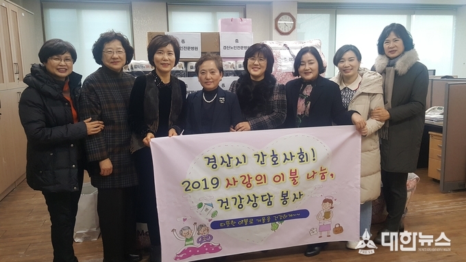 경산시간호사회(회장 정태련)는 12월 12일 사랑의 이불 20채, 화장지 20박스(150만 원 상당)를 보건소 방문건강관리대상자 가정에 전달하여 어려운 이웃들이 편안하고 따뜻한 겨울을 나는 데 도움이 되도록 하였다.