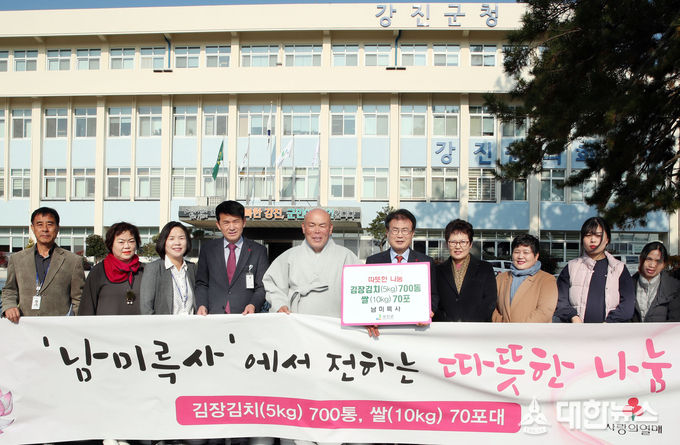 지난 16일 남미륵사는 강진의 어려운 이웃들과 사회복지시설에 전해달라며 김장김치 700상자와 쌀 70포를 전달하며 따뜻한 이웃사랑을 실천했다.