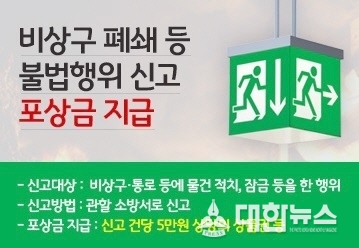 신고 포상 대상은 △다중이용업소, 대형 판매시설, 운수시설, 숙박시설, 위락시설에 설치된 비상구 폐쇄(잠금 포함) 차단 등의 행위 △복도, 계단, 출입구 폐쇄·훼손 △비상구 및 피난통로 물건 적치 등 피난에 지장을 주는 행위 등이다.