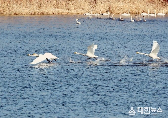 경자년(庚子年) 흰 쥐의 해 첫 날 전남 강진군 군동면 탐진강 하류에서 겨울을 나는 큰고니(천연기념물 제 201-2호)가 새해 꿈과 희망을 전하듯 수면 위를 힘차게 날아오르고 있다.