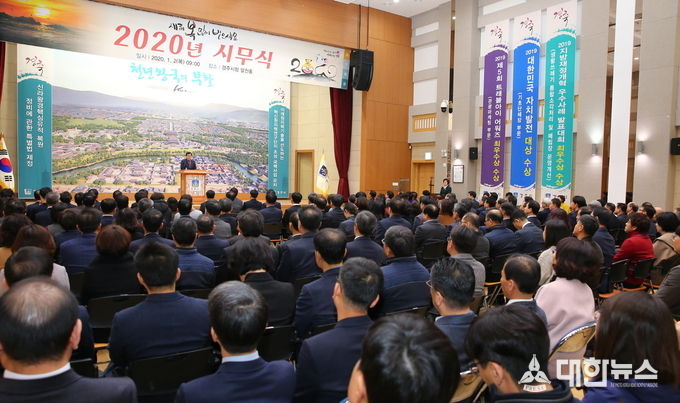 이어 시청 알천홀에서 본청 전 공직자들이 참석한 가운데 다사다난 했던 기해년 한해를 뒤돌아보며 희망찬 올 한해를 준비하는 2020년도 시무식을 가졌다.