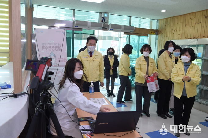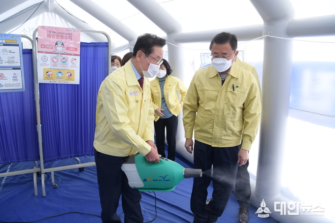 (대한뉴스 김기준 기자)=최기문 영천시장은 지난 6일 신종 코로나바이러스의 지역 유입예방과 사전 차단을 위해 선제적 방역대응을 펼치고 있는 영천시보건소를 찾아 선별진료소 운영과 방역대응체계 등을 점검하고 대응방안을 논의했다.