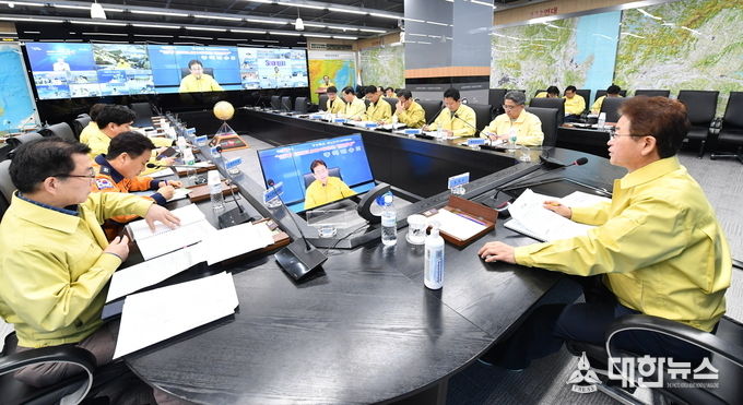 (대한뉴스 김기준 기자)=경상북도는 9일 재난안전대책본부장(도지사) 주관으로 부지사 및 실국장, 시․군 부단체장, 질병관리본부포항검역소, 법무부 포항출입국관리사무소, 포항지방해양수산청 등 신종코로나 바이러스와 관련된 차단방역 태세를 긴급 점검하는 유관기관 영상회의를 개최했다.