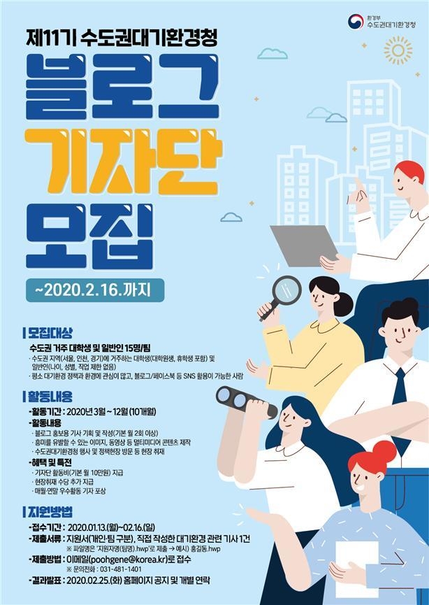 블로그기자단의 접수는 2월 16일까지 온라인을 통해 신청 가능하며, 관심 있는 기관 또는 단체는 수도권대기환경청 누리집에서 신청서를 내려받아 작성하여 제출하면 된다.
