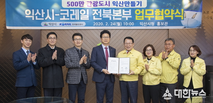 (대한뉴스 박청식 기자)=익산시와 한국철도공사(코레일) 전북본부(본부장 김광모)는 24일 오전 익산시청에서 업무 협약식을 갖고 ‘500만 관광도시 익산 조성’ 및 ‘철도 관광상품 활성화’를 위해 서로 노력할 것을 다짐했다.