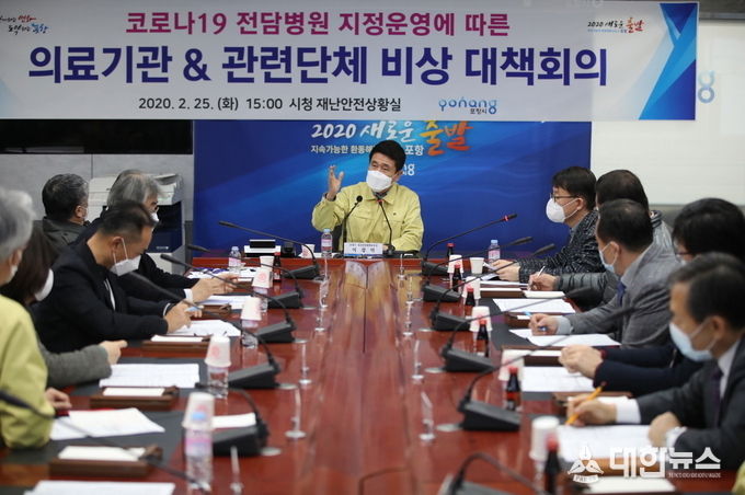 (대한뉴스 김기준 기자)=포항시는 25일, ‘코로나19’ 위기경보가 ‘심각’단계로 상향됨에 따라 ‘의료기관 비상대책회의’를 개최하고 급속도로 확산되고 있는 지역감염 상황에 대한 대응방안 마련을 위해 논의했다.