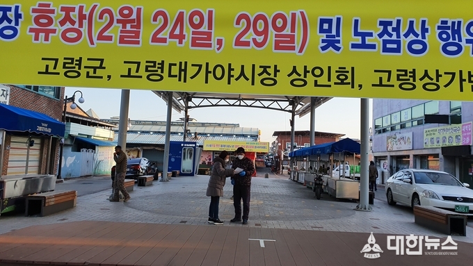 휴장 첫날인 2월 24일 고령대가야시장 일원에서 군 관계자 및 시장 상인회, 상가번영회 합동으로 외부 노점상 계도 및 코로나19 예방 캠페인을 전개하였다.