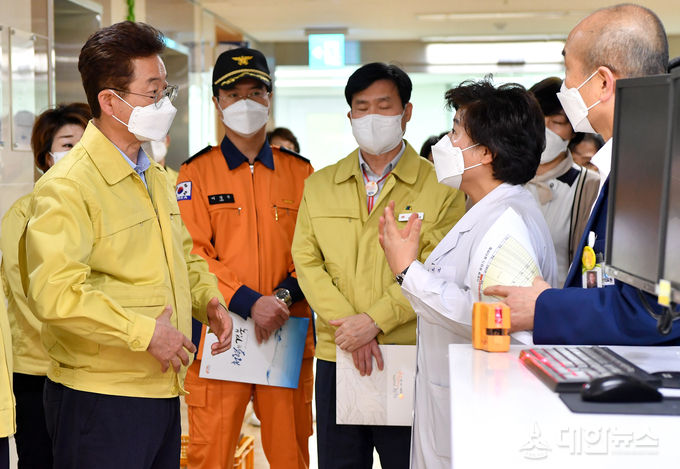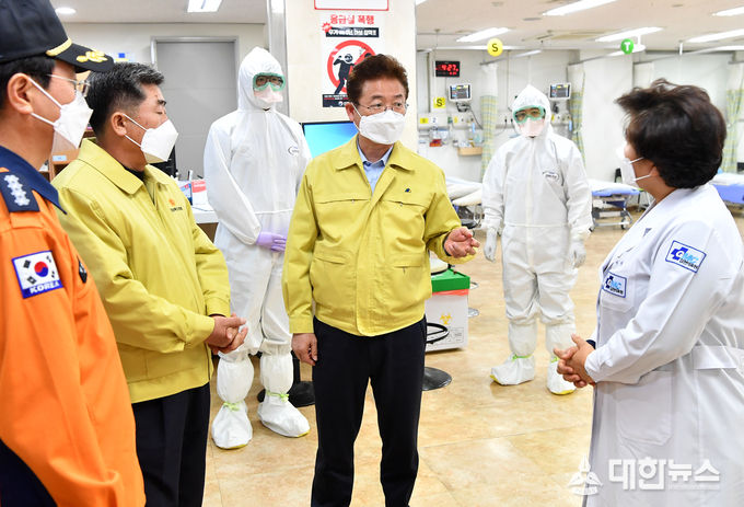 (대한뉴스 김기준 기자)=이철우 경상북도지사는 2월 27일(목) 오후 감염병 전담병원으로 운영되고 있는 김천의료원을 찾아 코로나19 환자치료에 여념이 없는 의료진을 격려하고, 확진자 치료현장을 점검했다. 김천의료원은 27일 현재 83명의 확진자가 치료를 받고 있다.