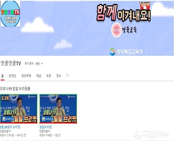 (대한뉴스 김기준 기자)=경북교육청(교육감 임종식)은 코로나19 확진자 급증으로 인한 학부모·도민의 불안감 해소를 위해 경북교육청 공식 유튜브 ‘맛쿨멋쿨TV’와 홈페이지를 이용해 안내한다고 27일 밝혔다.