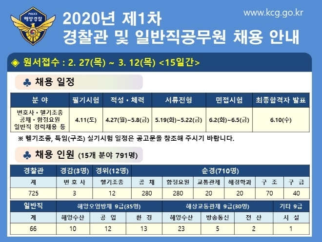 (대한뉴스 한원석 기자)=해양경찰청(청장 조현배)은 변호사, 헬기 조종사, 공채, 함정요원 등 15개 분야 총 791명을 채용한다고 28일 밝혔다.