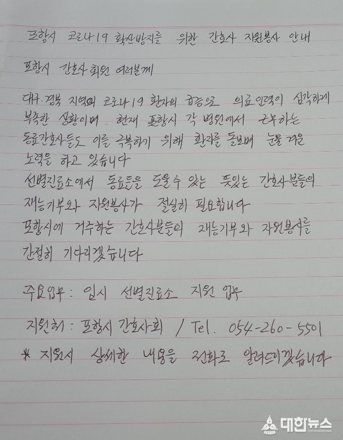 (대한뉴스 김기준 기자)=28일, 포항시청에 지역 간호사들의 자원봉사 동참을 호소하는 편지 한통이 도착해 화제가 되고 있다.