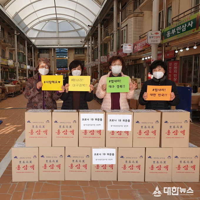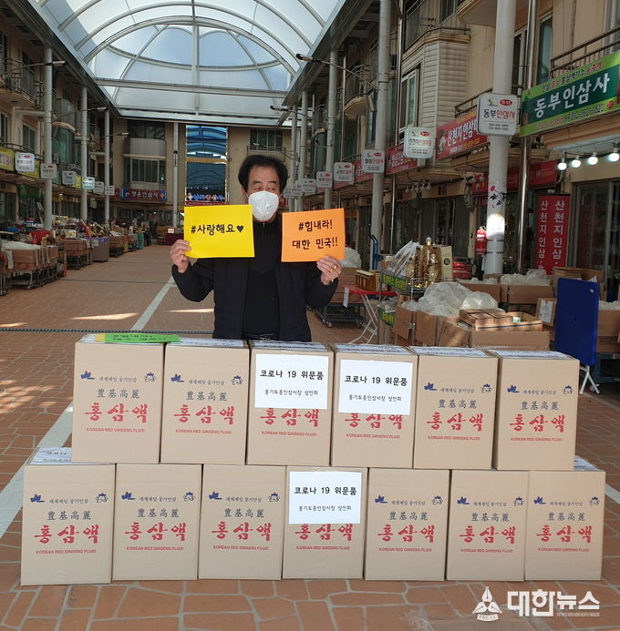 (대한뉴스 김기준 기자)=영주시 풍기토종인삼시장(상인회장 차건철)은 지난 2일 ‘코로나19’ 확산방지를 위해 힘쓰고 있는 영주시 재난안전대책본부를 방문해 상인회원들이 십시일반으로 모은 풍기인삼제품(2백 6십만원 상당)을 기탁했다.