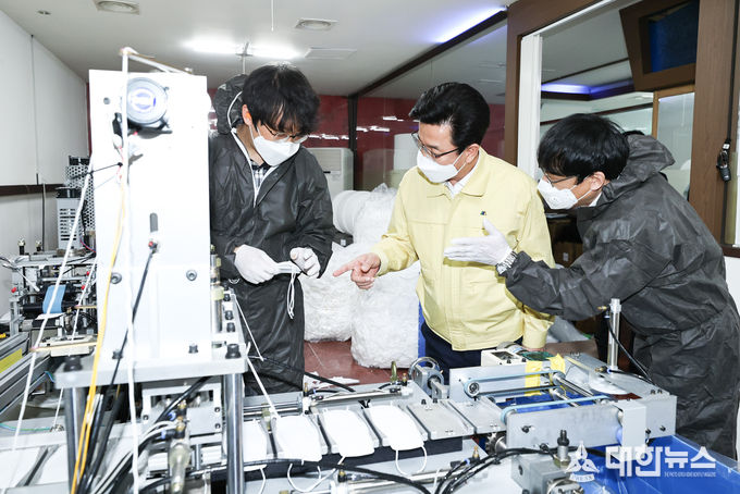 허태정 대전시장은 이날 마스크 제조현장을 찾아 구별 배분상황을 점검하고 신속한 조치를 당부했다.
