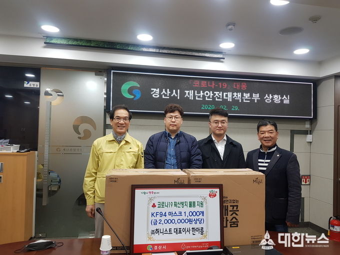 (대한뉴스 김기준 기자)=㈜허니스트(대표이사 한아름)에서는 코로나 바이러스 감염증 선별진료소에서 사용토록 29일 마스크 1,000개(금200만원 상당)를 경산시에 기탁했다.